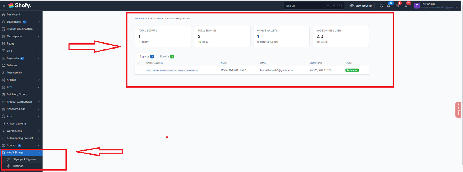 The plugin adds a Web3 Signup section in the admin panel with:
